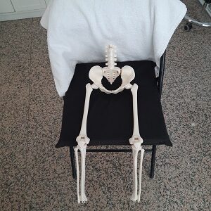 – pritrdi (imobilizira) medenične kosti, križnico v pokončnem položaju, ko je oseba v sedečem položaju,